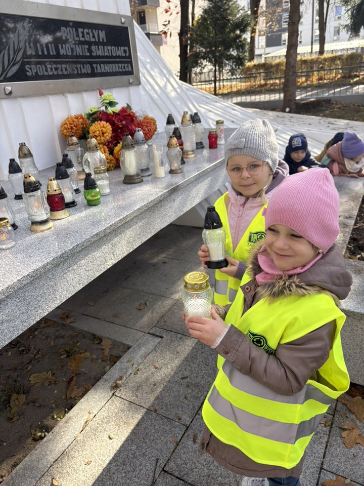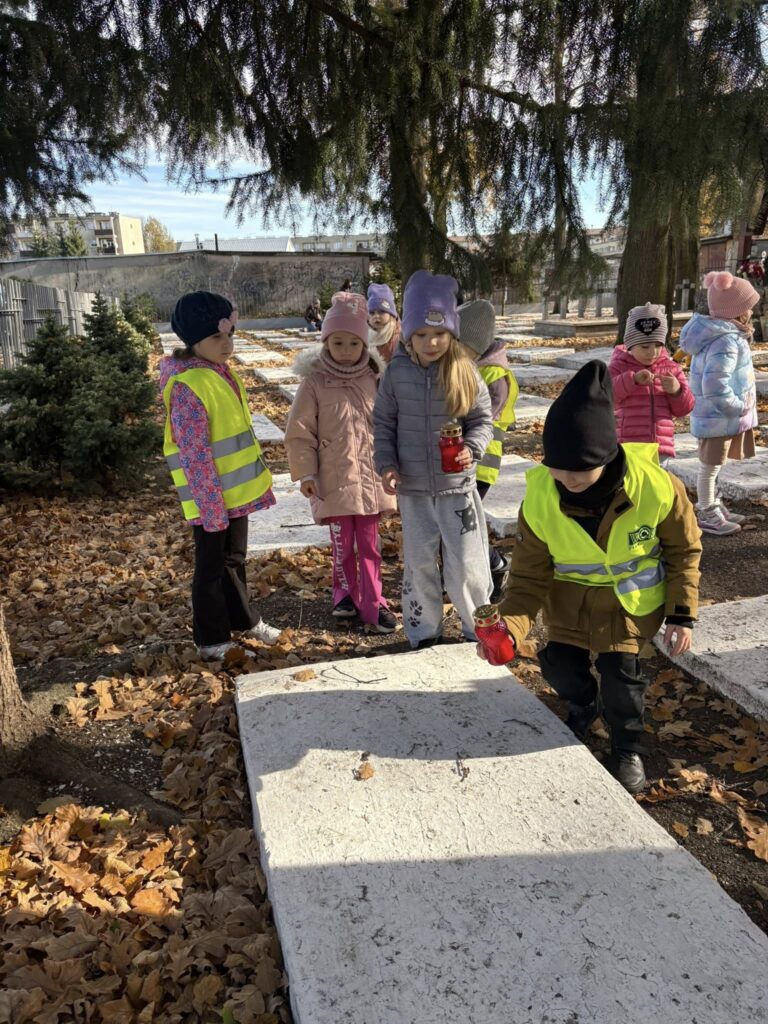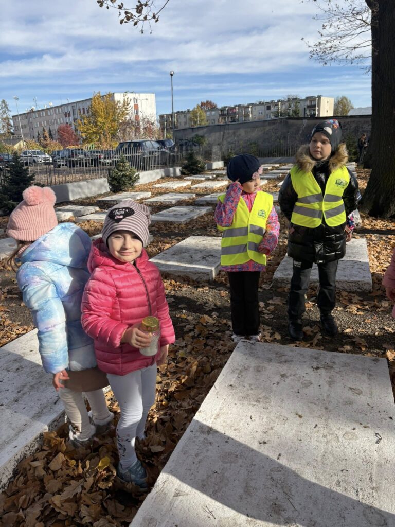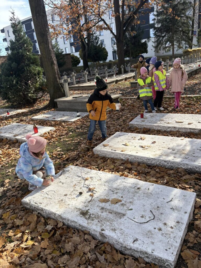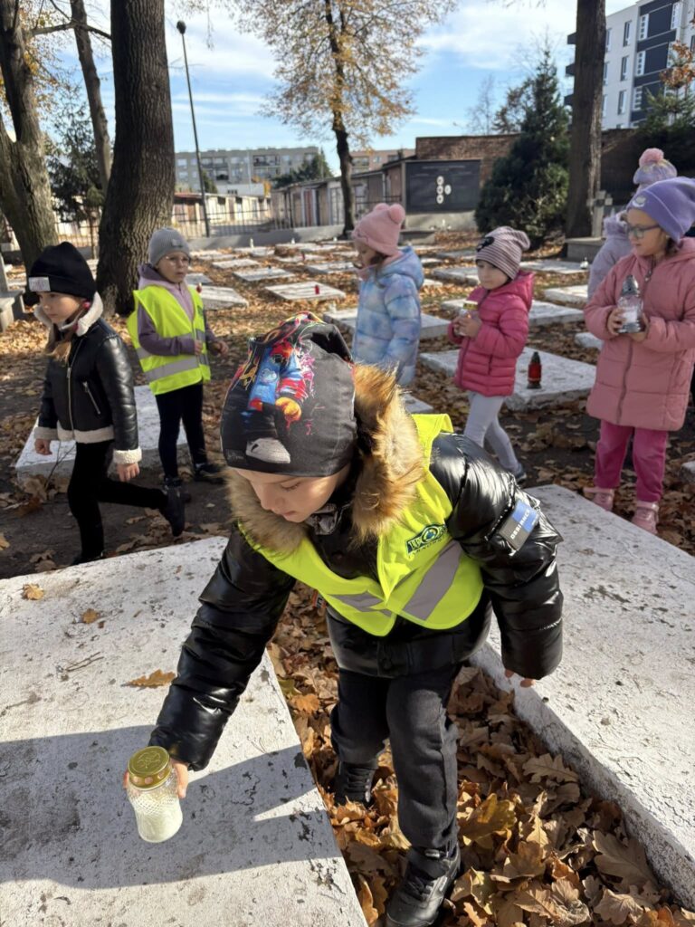 Dbając i kultywując piękną polską tradycję dzieci z grupy 6-latków wybrały się na Cmentarz Wojskowy w Tarnobrzegu i zapaliły znicze na grobach żołnierzy.