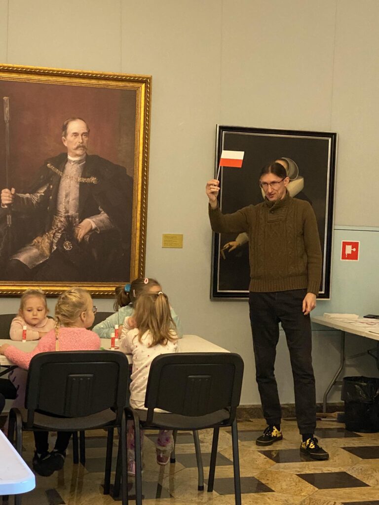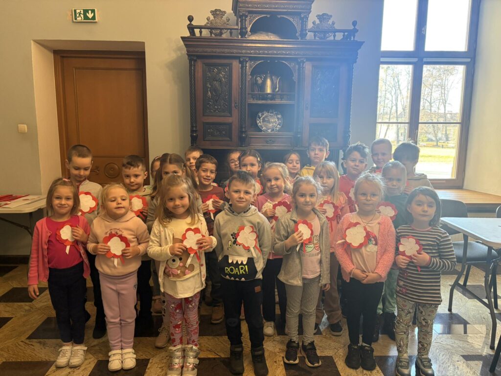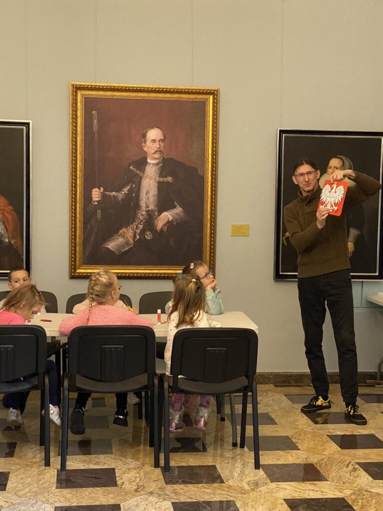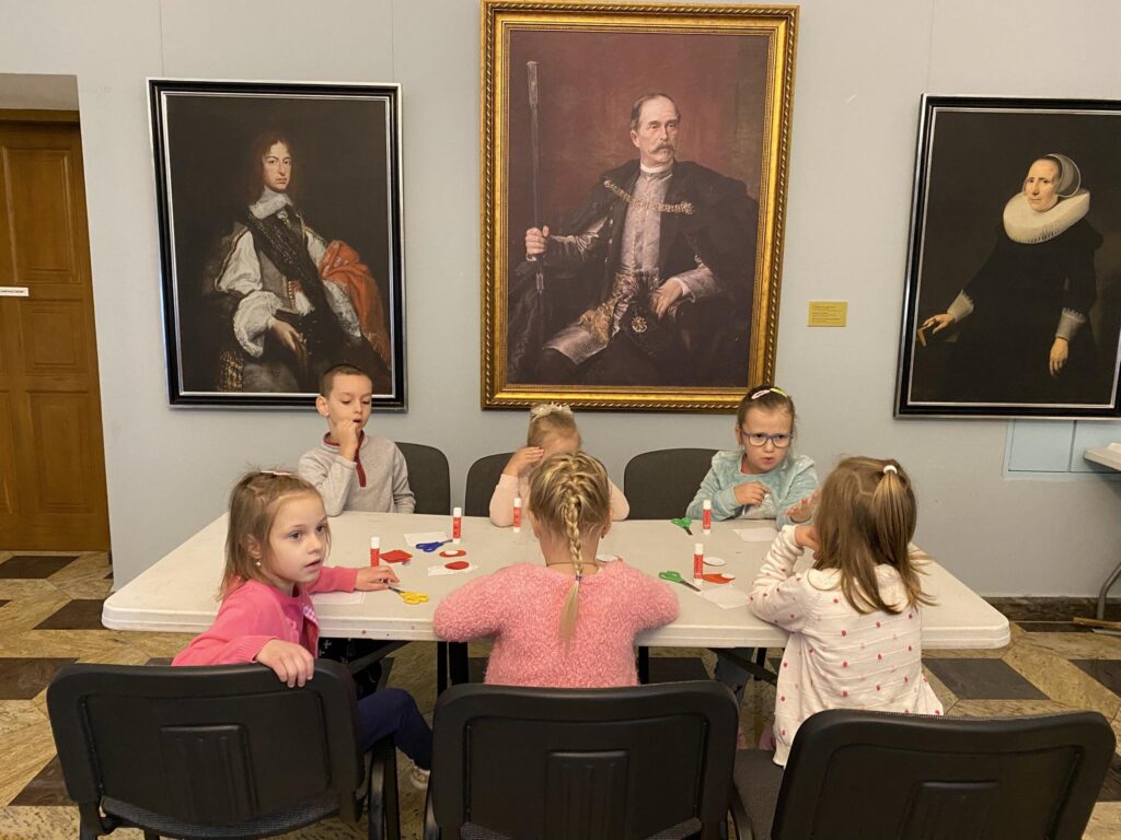 Warsztaty „Jaki znak Twój” Polskie Symbole Narodowe w Muzeum – Zamku Tarnowskich. Zajęcia poświęcone były przypomnieniu i utrwaleniu wiedzy o polskich symbolach narodowych. Dzieci zapoznały się z historią godła, flagi oraz hymnu państwowego – Mazurka Dąbrowskiego. Podczas warsztatów wykonały samodzielnie kokardę narodową.