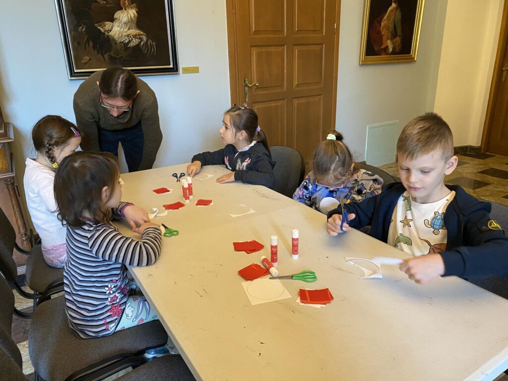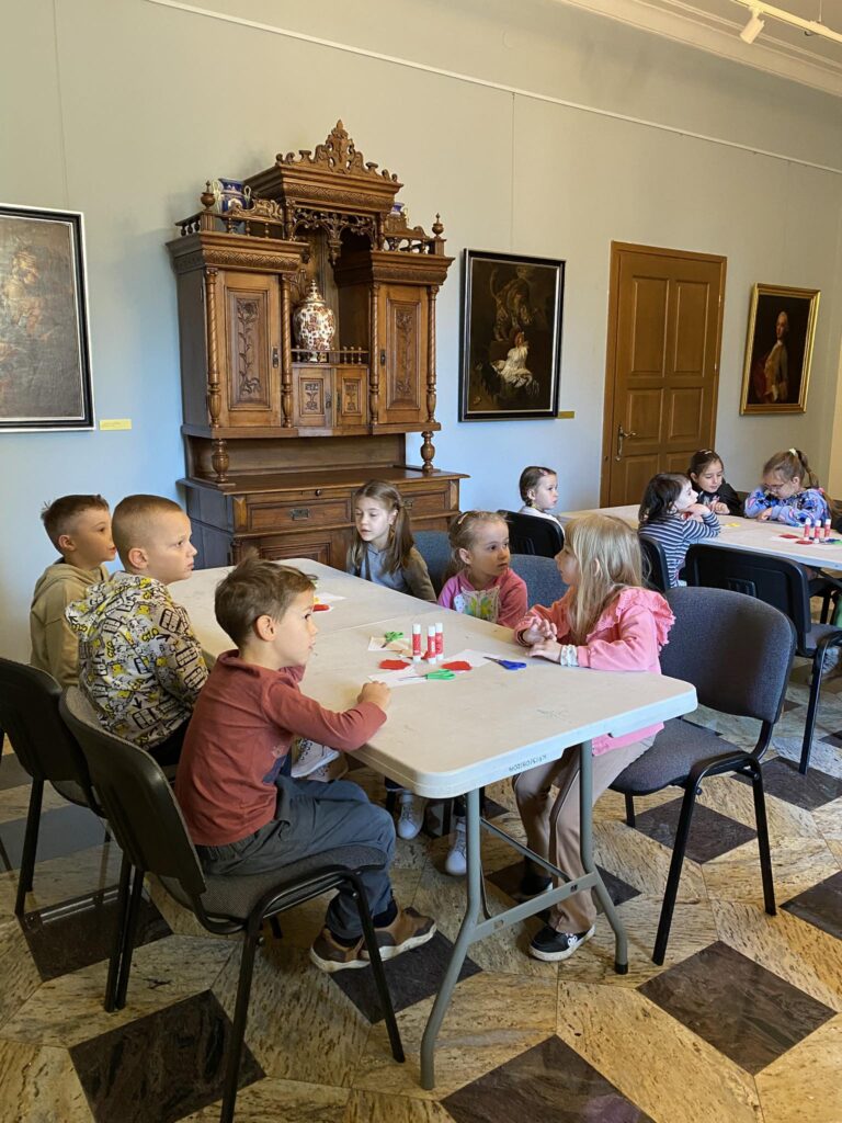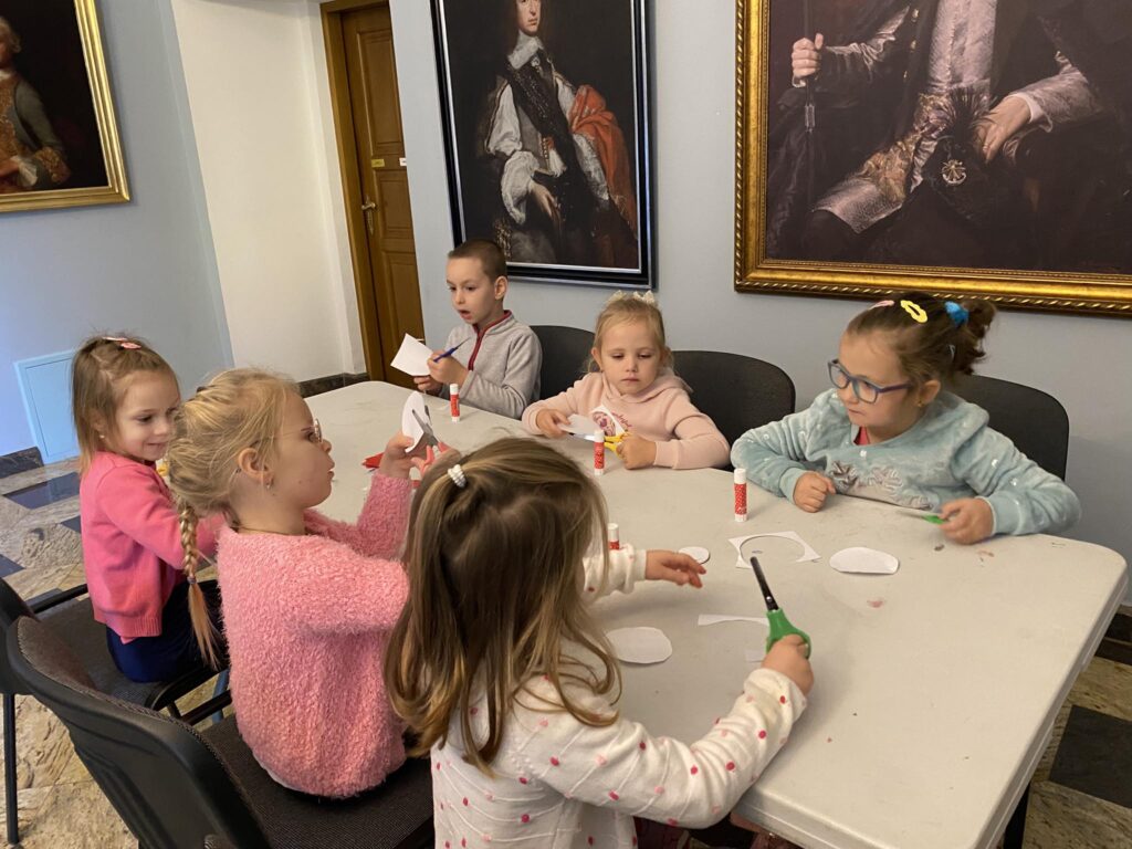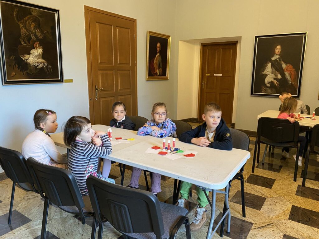 Warsztaty „Jaki znak Twój” Polskie Symbole Narodowe w Muzeum – Zamku Tarnowskich. Zajęcia poświęcone były przypomnieniu i utrwaleniu wiedzy o polskich symbolach narodowych. Dzieci zapoznały się z historią godła, flagi oraz hymnu państwowego – Mazurka Dąbrowskiego. Podczas warsztatów wykonały samodzielnie kokardę narodową.