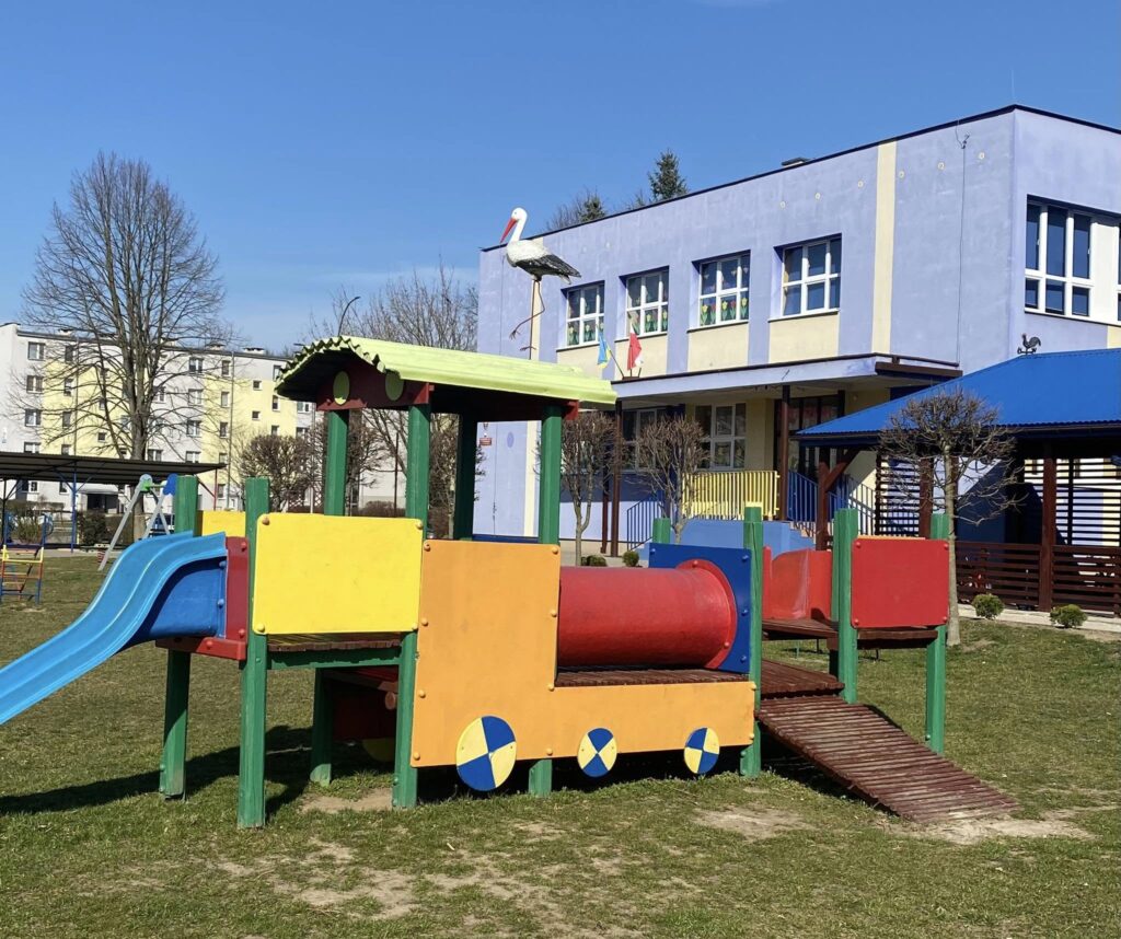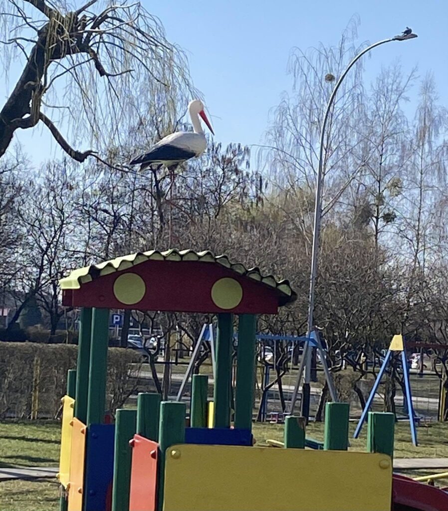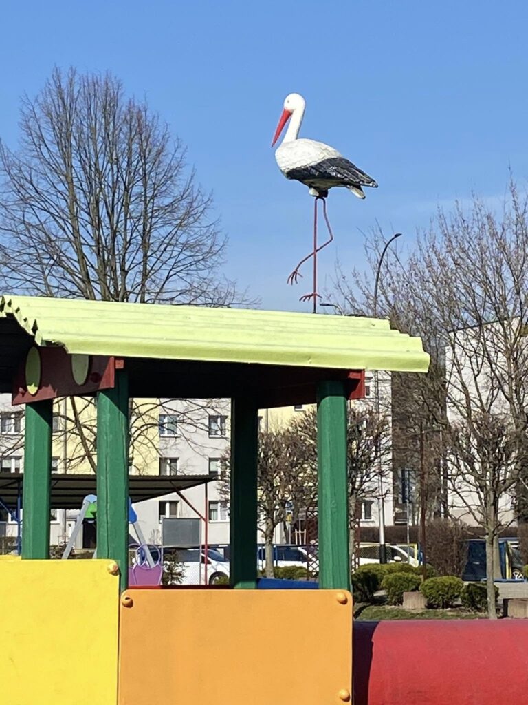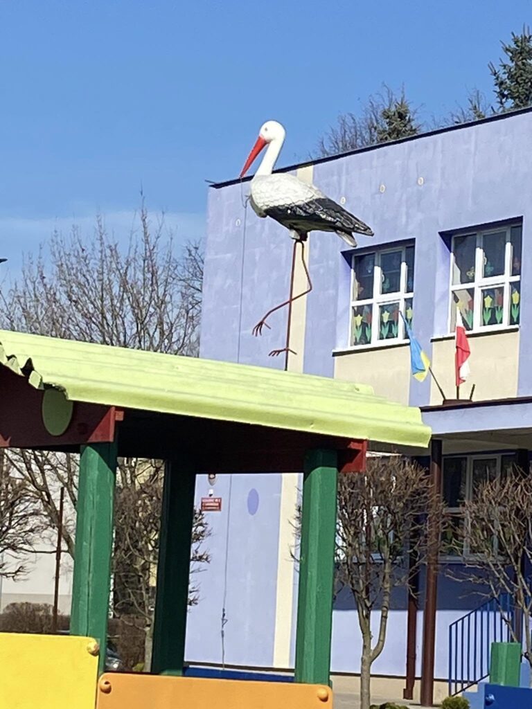 Nasze dzieci z radością powitały bociana, który stanął na daszku lokomotywy w ogrodzie przedszkolnym informując wszystkich o nadejściu wiosny.