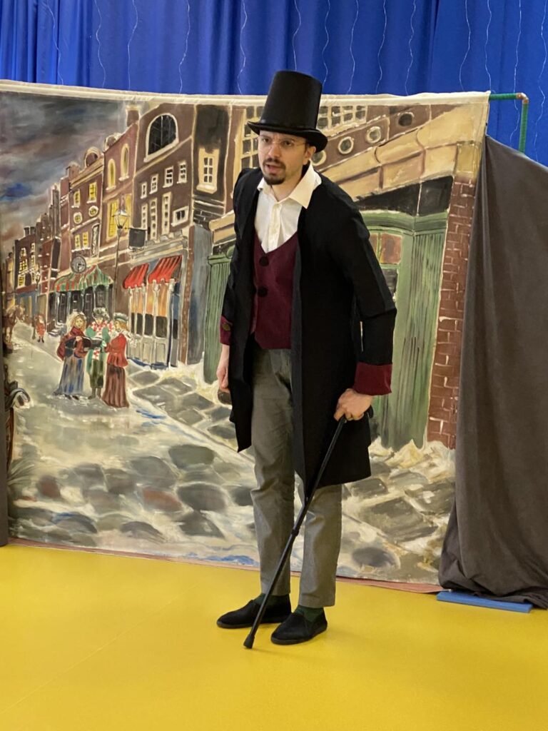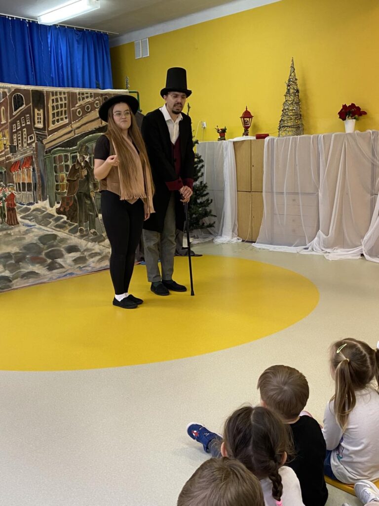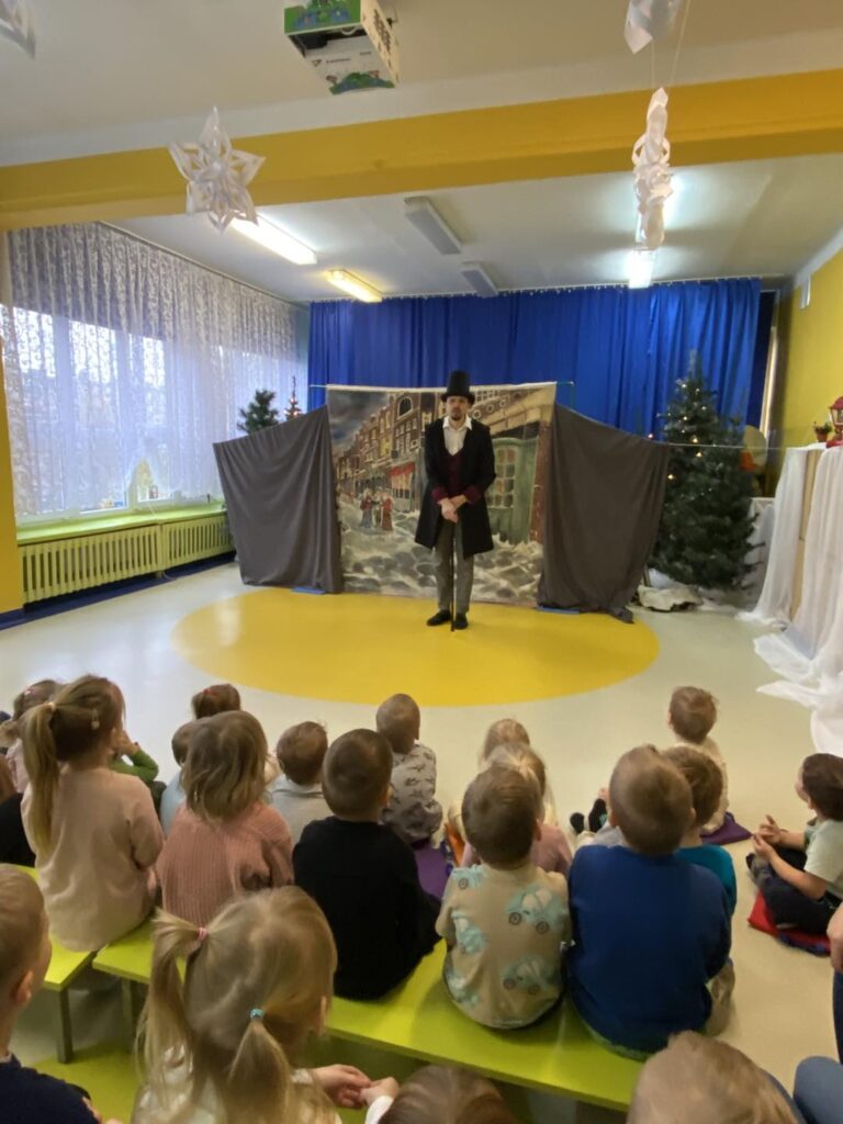 W dniu 12.12.2025r. w naszym przedszkolu gościliśmy aktorów Teatru Eden ze spektaklem pt. „Opowieść wigilijna”. Dzieci przeniosły się w magiczny świat, w którym losy skąpego Ebenezera Scrooge’a uczą, że dobro, życzliwość i otwarte serce są najpiękniejszym prezentem, jaki możemy podarować innym. Podczas przedstawienia najmłodsi z zaciekawieniem obserwowali niezwykłą przemianę bohatera i odkrywali, co naprawdę jest ważne w czasie Świąt Bożego Narodzenia — bliskość, ciepło, serdeczność i dzielenie się radością.
